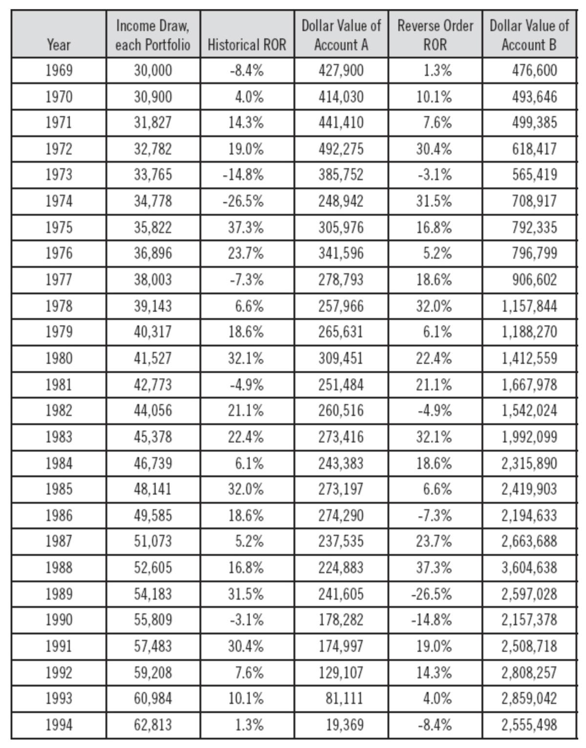 Most people assume that some conservatively estimated rate of return for a portfolio, coupled with a conservatively set withdrawal rate, will result in success in the same way a long- term stock portfolio (e.g., the S&P 500 index) is successful. They assume the portfolio cannot be exhausted with a low withdrawal rate and a high average rate of return. But this is far from true. The chronological order of losses and gains (returns) makes a dramatic difference in success. The following table shows two hypothetical $500,000 portfolios. Each has an identical average rate of return at 11.3% and runs twenty-six years. The income draw is identical, starting at 6% of portfolio value and inflating 3% annually. The only difference between the two is that B has the sequence of returns reversed. While this illustration can work with any time frame and set of returns (hypothetical or real), I picked the starting year of 1969 in order to show a modest loss in the first year and to avoid the anomalous gains and losses of the last quarter century.